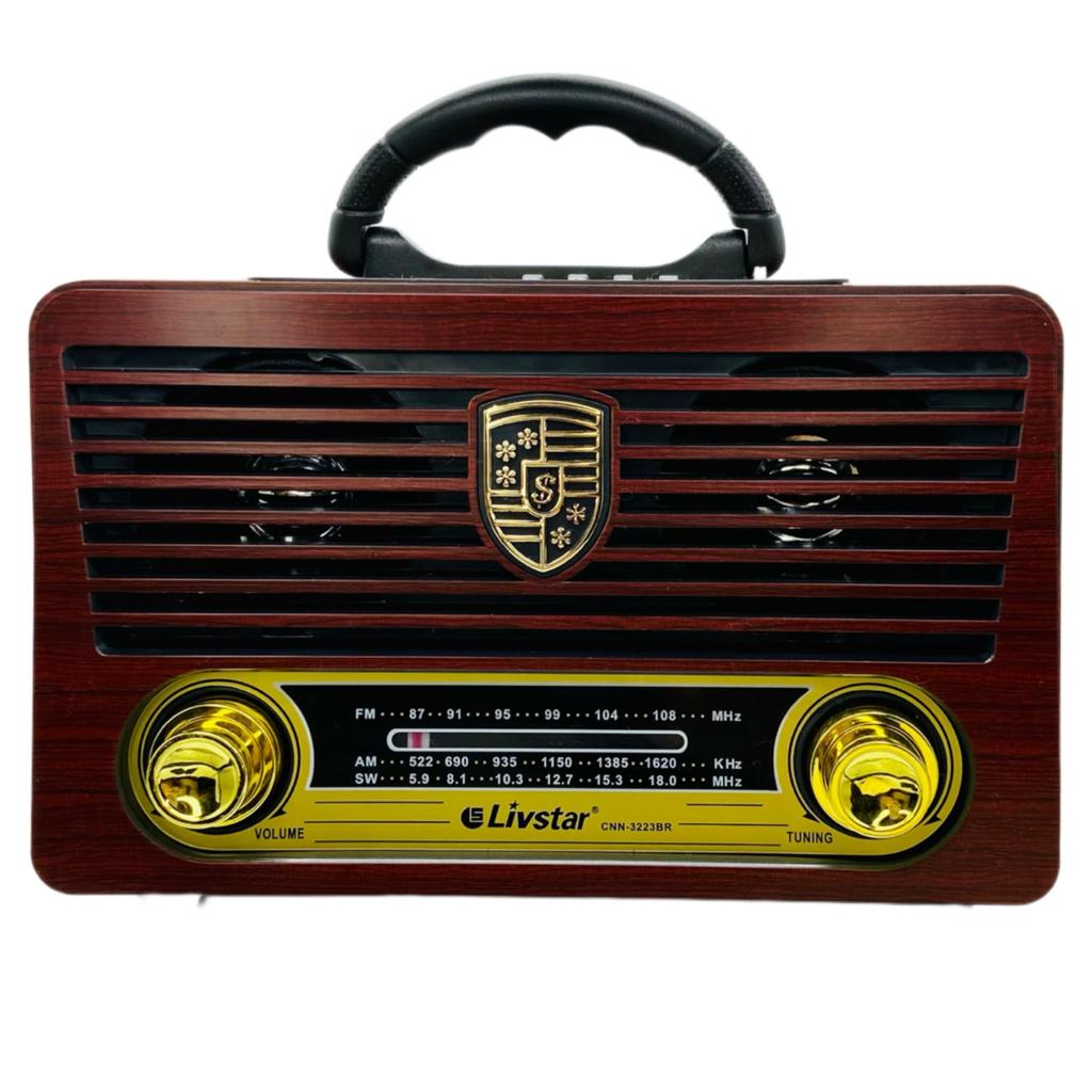 Rádio Retrô com 3 bandas de rádio, FM AM SW. Possui porta USB, porta para cartão de memória e entrada auxiliar. Funcionamento via cabo ou bateria (bateria não inclusa). Possui despertador e autofalante com 5W de potência.